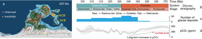 人类活动引起大气二氧化碳浓度显著升高,地球很可能从现今的冰室演化为温室气候状态。当前国际科学界面临的重大科学命题就是:地球如何从冷变暖进入温室状态的? 在这过程中地球内部、外部圈层的变化及其相互关系是什么样的?目前地球经历的气候变化在人类时间尺度中没有先例。为更好的了解当前和今后地球气候发展趋势,需要剖析冰室消亡过程的深时记录,为预测未来气候变化趋势及其可能造成的影响提供科学依据。约发生在3亿年前的晚古生代冰期记录了地史中唯一一次在植被覆盖的情况下冰川由盛转衰的过程,使其成为最接近地球当前气候状态的重要深时模板(图1),但其消亡的触发机制和详细过程仍存大量争议。