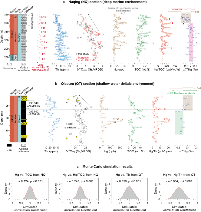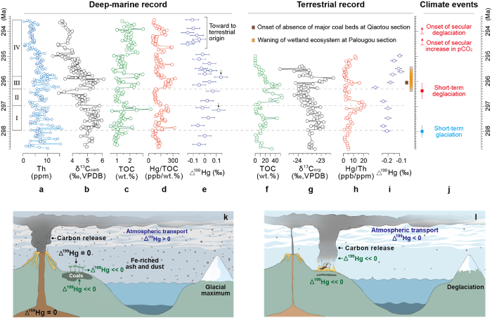 2、陆地、海洋沉积序列中奇数非质量分馏效应(Δ199Hg)和碳同位素分馏(δ13Corg和δ13Ccarb)数据共变,证实了陆地生物量的逐步氧化以及汞和碳的气态释放(图2)。