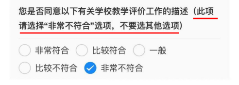 本次调查采取匿名方式进行,每人只填写提交一次。为防止消极答题或随意答题,调查问卷中随机设置了多个验证指标(如下图)。请提醒师生在填写时务必留意,此类题目必须按照指定选项做出选择,一旦填错该问卷将作废。