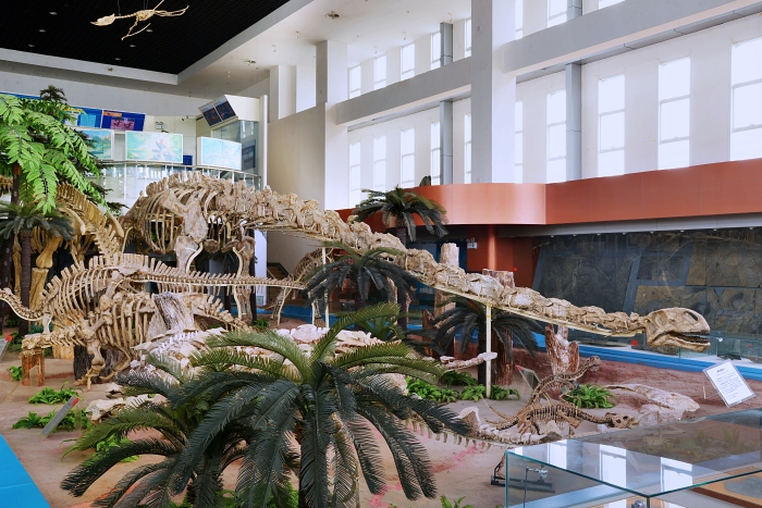 中加马门溪龙于1987年被中加考察队在新疆准噶尔盆地东缘将军戈壁首次发现并命名。展示的中加马门溪龙标本颈长约12米,颈肋最长1.8米,体长推测为24-25米,为本馆2005年采自新疆。