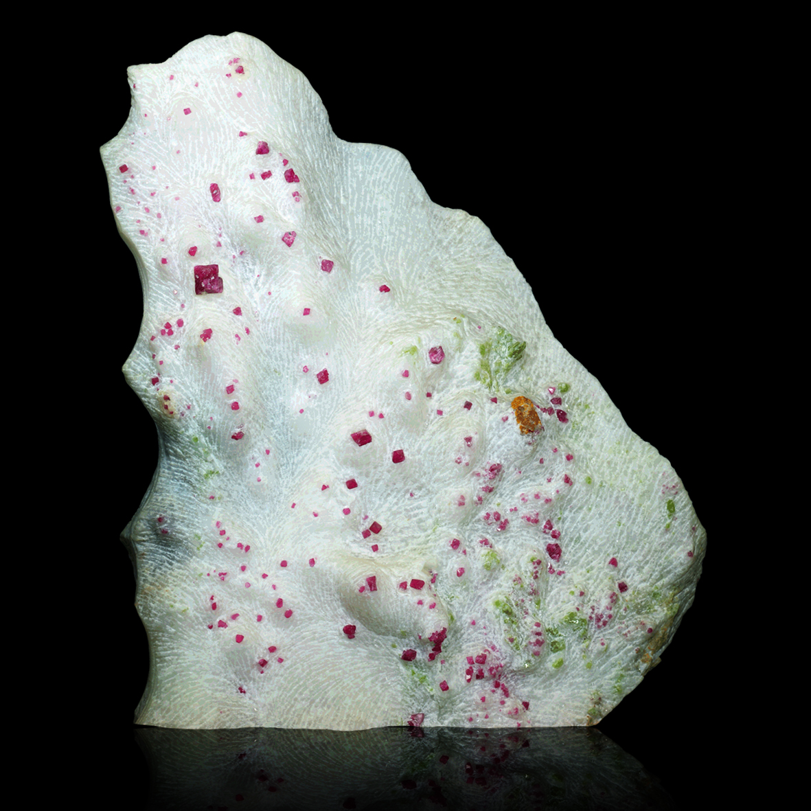 物理性质:通常呈红色(Cr含量少于15%),绿色(含少量Fe3+)或褐黑色(含Fe2+和Fe3+);玻璃光泽。硬度8.无解理;偶有平行(111)裂开。相对密度为3.55。