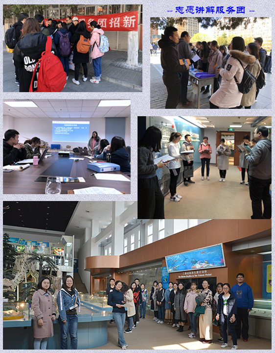 2019年3月,博物馆第一次通过面向全校学生公开招聘、面试选拔,成立志愿讲解服务团。志愿讲解服务团现共有志愿讲解服务人员22人,分别来自地球科学与资源学院、土地科学技术学院、珠宝学院、海洋学院、工程技术学院、水资源与环境学院、能源学院、信息工程学院、材料科学与工程学院和经济管理学院。志愿讲解服务团的工作任务除讲解接待外,还包括团体参观时团队秩序维护、科普宣传、活动策划等工作。