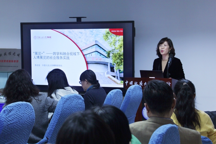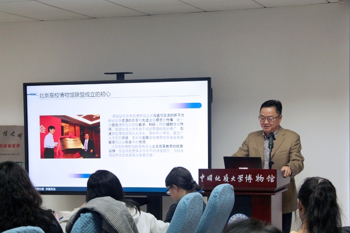 3月25日下午,由北京高校博物馆专业委员会、北京高校博物馆联盟主办,中国地质大学(北京)博物馆承办的“馆长论道——高校博物馆业务交流会”(第六场)在中国地质大学(北京)博物馆内举行。本次会议的主题为“高校博物馆如何依托高校优势,发挥社会服务作用”。会议设置了主题报告、主题交流、参观展览等环节。成都自然博物馆/成都理工大学博物馆,中国传媒大学传媒博物馆,中国地质大学(北京)博物馆,中国人民大学博物馆,清华大学科学博物馆,北京林业大学博物馆,北京中医药大学中医药博物馆,对外经济贸易大学对外经贸博物馆,中央民族大学民族博物馆,中国政法大学博物馆,北京服装学院民族服饰博物馆,北京舞蹈学院舞蹈博物馆,北京外国语大学档案馆、校史馆、世界语言博物馆,北京联合大学档案(校史)馆,首都经济贸易大学档案馆、校史馆,北京理工大学校史馆,北方工业大学校史馆艺术馆,北京交通大学档案馆等共18家高校博物馆、校史馆馆长、相关负责人和中国旅游报、新华网媒体记者,共计40余人参加会议。会议由北京高校博物馆联盟秘书长、中国地质大学(北京)博物馆馆长施光海主持。