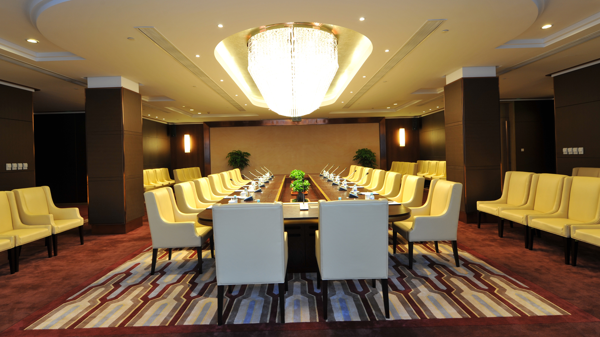 中会厅面积160平方米,位于南楼一层,固定长方形台可坐20人,长方形台+场下可坐50人,厅内配备麦克风和多媒体投影仪。