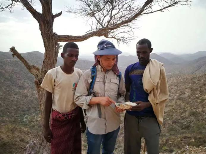 施光海在非洲索马里兰玉矿考察时为村民讲解矿石