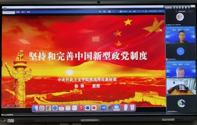 徐锋教授从中国的新型政党制度是怎么样的、我们为什么要坚持这一政党制度、新时代里怎样坚持完善这一制度三个问题出发,围绕新型政党制度是现当代中国的一项基本政治制度;其结构、功能和运行;价值、特色和优势;坚持好发展好完善好中国新型政党制度四个方面进行了全面系统、深入细致的讲解。