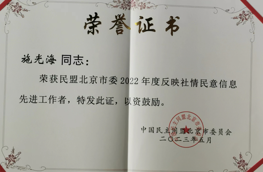 北京市政协委员、盟员施光海教授提交《官厅水库479线以下退耕还林草》《对北京部分密窄道实行单向行驶,以提高其畅通性》《使用本地著名产地岩石作为北京城市景观石》等市政协提案10余件,得到北京市相关部门重点关注。