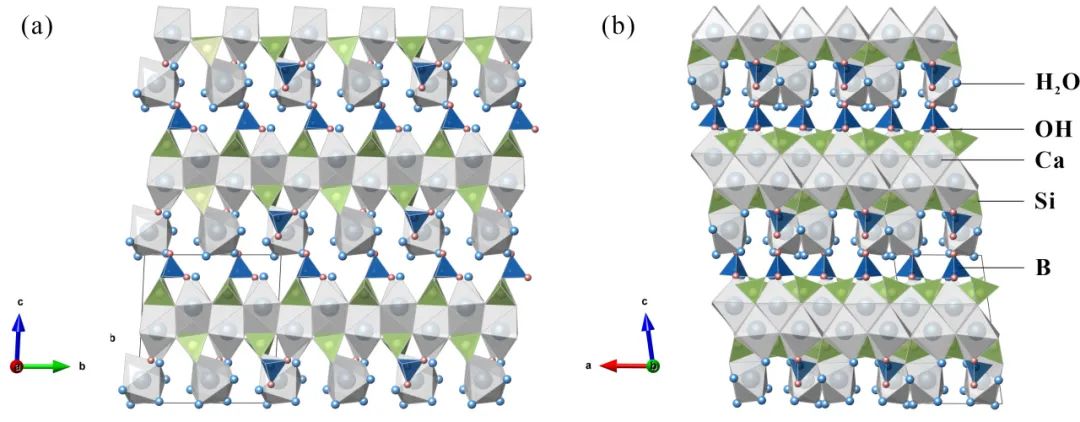 施硼硅钙石呈浅粉色,薄片状晶簇集合体,主要共生矿物为方解石、钙铁榴石、萤石及鱼眼石等。其理想化学式为Ca5[BSi2O7(OH)2]2·6H2O,实测化学式为Ca4.94[B0.99Si2.03O7.02(OH)1.98]2·6H2O。施硼硅钙石的晶体结构与水硅硼钙石及雪硅钙石族矿物结构具有相关性。雪硅钙石族是一系列高度水合的钙硅酸盐矿物,是硅酸盐水泥水化过程中出现的重要物相。而施硼硅钙石的晶体结构在继承了雪硅钙石族矿物结构骨架的基础上加入了硼氧四面体,是一种罕见且复杂的新型硼硅酸盐矿物。