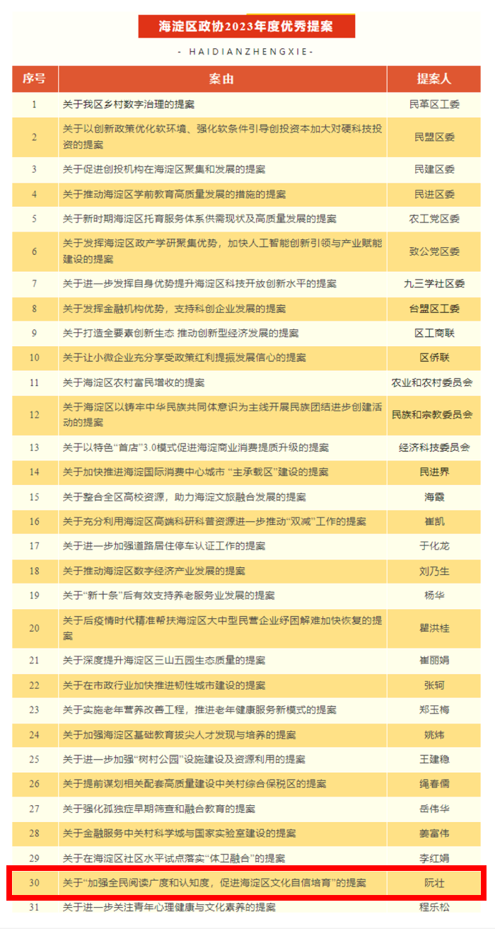 根据《政协北京市海淀区委员会关于评选表彰优秀提案工作的实施办法》,经政协北京市海淀区第十一届委员会第12次主席会议研究,决定对《关于我区乡村数字治理的提案》等31件提案予以表彰。