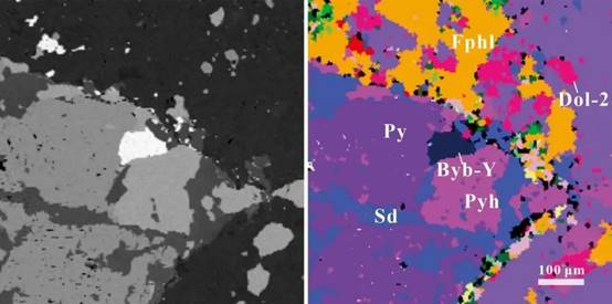 白云钇钡矿是在对白云鄂博矿区深部岩芯进行扫描电子显微镜自动矿物分析(TIMA)研究中发现的,通过单晶X射线衍射确定其晶体结构为一种全新的氟碳酸盐结构类型,新矿物多见100微米左右的无色透明晶体,理想化学式为Ba2Y(CO3)2F3,斜方晶系,空间群Pbcn。本次发现的白云钇钡矿是一种全新成分组成和全新结构的的重稀土氟碳酸盐新矿物,成分中除Y外还含有Dy,Gd,Er,Lu等重稀土元素,此前世界上从未发现过类似成分结构的天然矿物。