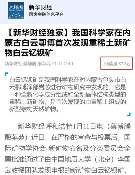 《新华财经》、央视网和香港01等多家媒体平台对新矿物发现进行了广泛宣传报道,其中《新华财经》发布的相关新闻获得阅读量87.5万。