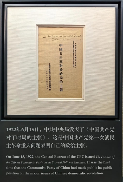 中共二大会址纪念馆展陈介绍《中国共产党对于时局的主张》。