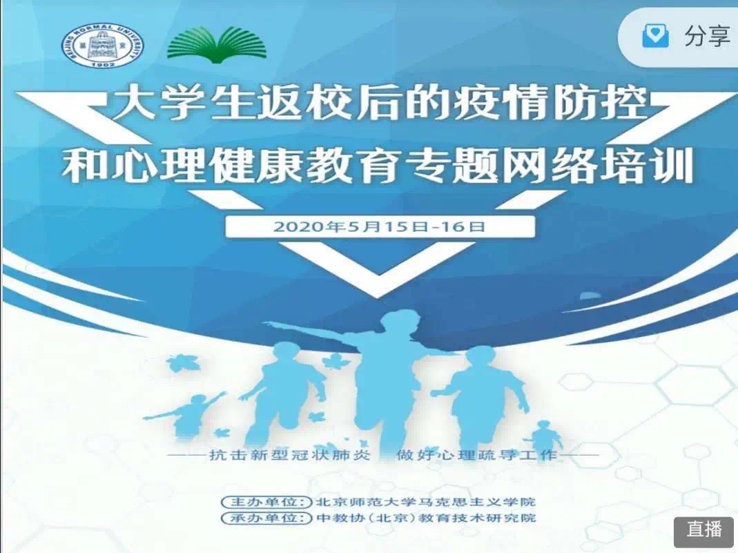 为切实做好学生复学阶段的疫情防控工作特别是新冠肺炎疫情下的学生心理疏导工作,提高高校疫情防控工作队伍的科学化、专业化水平,我院应学校要求组织学工系统人员参与北京师范大学马克思主义学院举办的“大学生返校后的疫情防控和心理健康教育专题网络培训”。学院13名专兼职辅导员参加了此次培训。