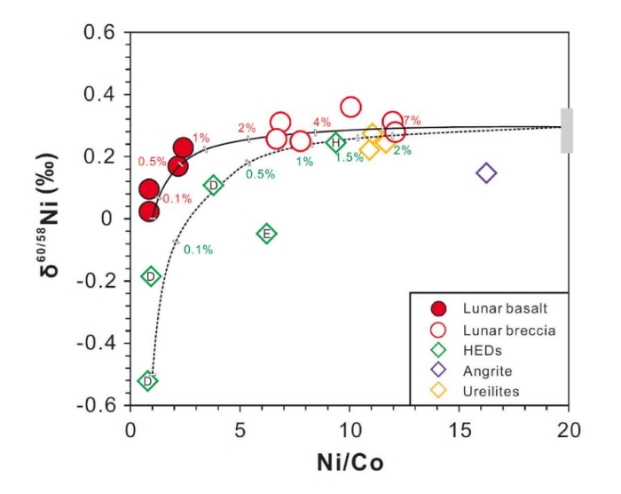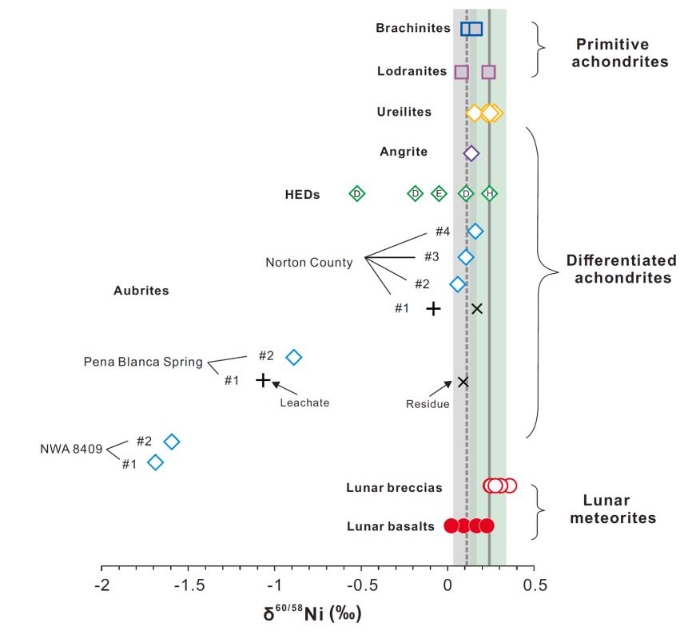 为了检验上述假说,我校王水炯教授联合贵阳地化所李世杰研究员和中科院地质与地球物理研究所林杨挺研究员对无球粒陨石和月球样品开展了系统的Ni同位素地球化学研究。发现: