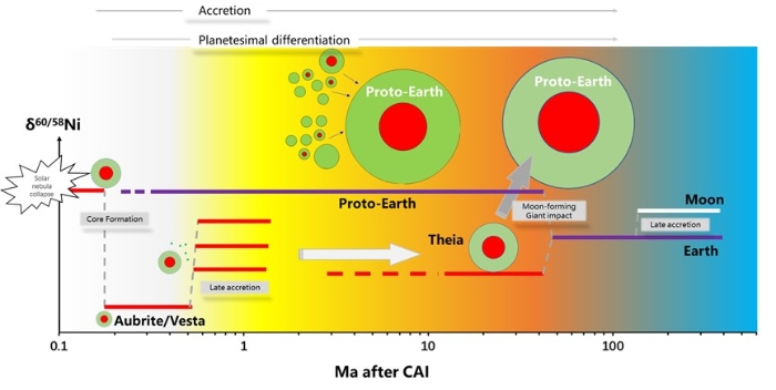 据此,刻画了行星增生和分异过程中Ni同位素地球化学行为,为理解类地行星的形成和演化,尤其是地月体系的形成提供了重要依据(图3)。
