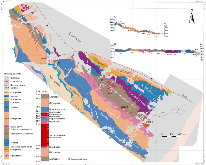 镍是全球极紧缺的新能源金属,其资源形势直接影响我国在全球的新能源战略部署。金川矿床是全球单体最大的岩浆铜镍硫化物矿床(图1),镍储量居全国第一位,铜、钴储量居全国第二位,另外伴生有16种稀有贵重金属,其成因长期以来备受国际学界关注。目前金川矿床巨量硫化物饱和熔离机制仍存在较大争议,前人提出金川岩浆-碳酸盐岩边缘反应模型,即在岩浆-大理岩接触带的脱碳过程中,释放的CO2会提高岩浆的氧逸度,从而降低岩浆体系的Fe2+/Fe3+,导致硫化物饱和时硫的溶解度(SCSS)降低,最终触发岩浆发生硫化物饱和熔离。然而,该模型缺少岩浆与碳酸盐岩相互作用对氧逸度影响的定量化证据,难以确定碳酸盐岩混染和SCSS之间的关系。此外,硅铝质地壳混染、外源硫加入也被认为是触发金川硫化物熔离的潜在关键过程,其同化混染的时空尺度仍待精确厘定。