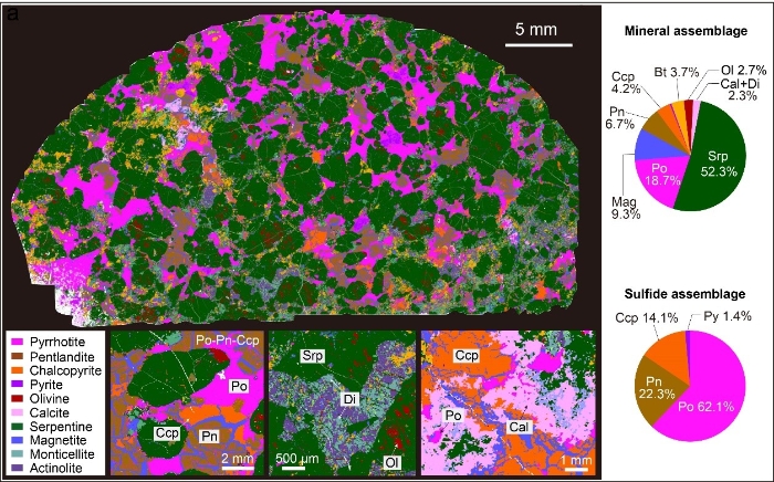 1、矿物自动定量分析精确识别出含“方解石残斑”的矿化超镁铁岩(图2),其C同位素组成与大理岩接近,而未含“方解石残斑”矿化超镁铁岩的C同位素组成接近地幔值(图3);氧逸度计算结果显示两类矿石的fO2相似,表明碳酸盐岩混染并未显著改变金川成矿岩浆体系的氧化还原状态。与该结论一致的是,金川岩体在新元古代侵位时期的上覆地层厚度小于10公里,其对应的~0.3 Ga压力状态下的玄武质岩浆仅能溶解几百ppm CO2,显然该体量对金川成矿岩浆体系超过105 ppm FeO的氧化效应极其微弱,因此岩浆-碳酸盐岩边缘反应模型并非巨量硫化物熔离的主控因素。