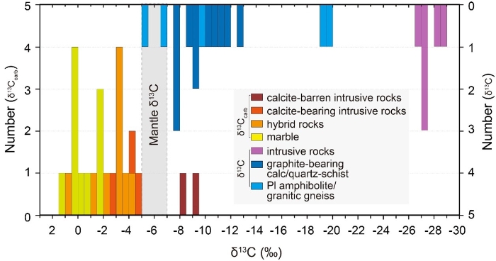 图3 金川岩体、接触带混合岩和围岩碳同位素组成