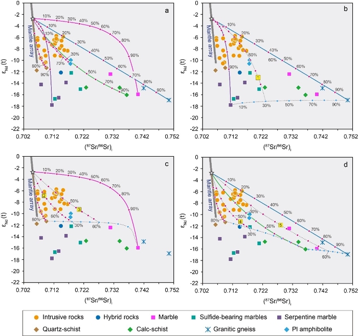 2、金川岩体具有富集的Sr-Nd同位素特征,混染端元的差异选择导致目前存在直接围岩混染和深部地壳混染的不同认识。金川矿区围岩(纯大理岩、蛇纹石大理岩、斜长角闪岩、片麻岩、混合岩、片岩)Sr-Nd同位素与幔源岩浆的端元混合计算结果显示,成矿岩体的Sr-Nd同位素组成难以由任何一种或多种直接围岩的混染作用解释(图4),表明岩体Sr-Nd同位素富集特征继承自源区和深部硅铝质地壳混染。