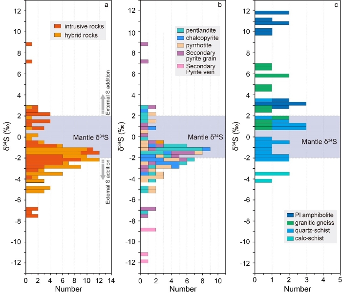 4、综上所述,侵位尺度碳酸盐岩混染对金川成矿贡献有限,深部硅铝质地壳混染和外源硫加入是金川超大型矿床巨量硫化物熔离的主要机制。与全球重要岩浆铜镍矿床成因对比可发现,深部混染触发的岩浆早阶段巨量硫化物熔离是全球铜镍成矿普遍事件。