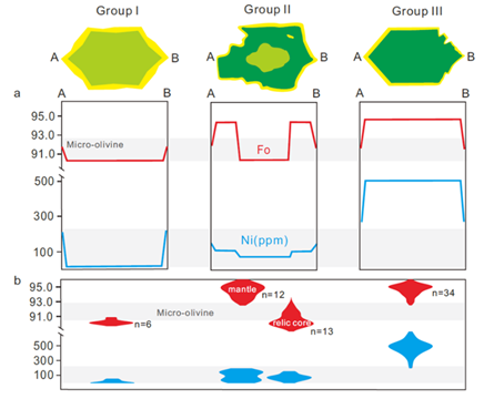 Group II橄榄石具有反环带结构,且呈现溶蚀和再结晶的特征。这组橄榄石的核部和Group I橄榄石成分类似,而其幔部具有高Fo值与低Ni含量 (Fo92.4-95.4, Ni 8-188 ppm)。以上特征表明,Group II橄榄石是Group I橄榄石和一个富Mg,贫Ni的岩浆相互作用形成。