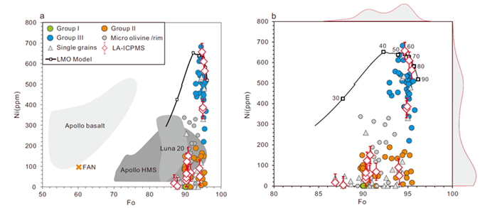 研究人员通过模拟月球岩浆洋结晶过程中橄榄石成分的演化,确认Group III橄榄石很可能具有月幔成因,且化学成分上和岩浆洋结晶出的首批橄榄石极为类似。