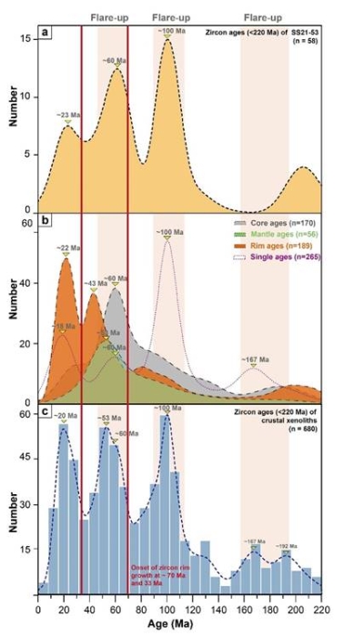 (1)通过桑桑下地壳捕掳体锆石U-Pb深度剖面分析成功重建了冈底斯大陆地壳的演化历史。研究结果与前人研究数据匹配(图2,图4),包括冈底斯带岩浆岩数据库记录的多阶段弧岩浆作用、印-亚碰撞、板片回卷、板片断离等关键地质事件。