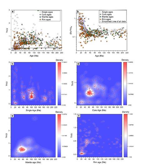 (2)锆石核-边年龄与微量元素变化揭示印-亚汇聚过程中冈底斯大陆地壳的系统性转变。后碰撞阶段锆石核部年龄(新生)逐渐减少而边部年龄(次生)逐渐增加,反映了幔源岩浆通量的减少与大陆地壳深熔作用的增强(图2),与同期锆石Th/U与(Dy/Yb)N变化趋势所指示的地壳加厚与深熔一致(图3)。