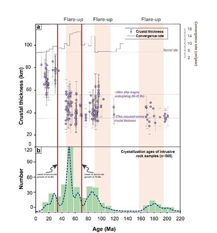 图4 前人研究中的印-亚汇聚速率、冈底斯带地壳厚度演化与岩浆岩年代学数据库