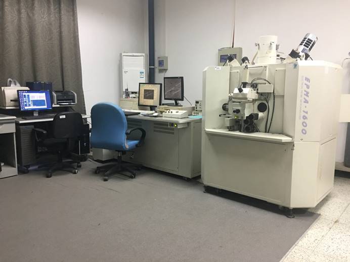电子探针实验室拥有日本岛津公司生产的EPMA-1600型电子探针分析仪、EPMA-1720型电子探针分析仪,配备有波谱((5道)、牛津能谱分析仪和镀碳仪等。