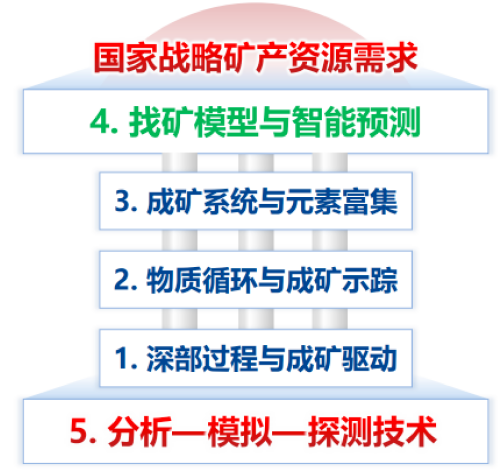 地质过程与成矿预测全国重点实验室聚焦“铁、铜、金”等战略性矿产资源国家重大战略需求背后的科技问题,突出矿床的形成机制、成矿作用的地质过程以及矿床的时空分布规律基础研究和矿产预测、勘查和评价理论与方法技术创新,整合地球物理学、大数据科学、计算机科学、信息科学、遥感科学与技术等重点学科,将具体研究方向定为五个部分:①深部过程与成矿驱动;②物质循环与成矿示踪;③成矿系统与元素富集;④找矿模型与智能预测;⑤分析-模拟-探测技术。其中,①-③提供深部过程和动力学理论背景,聚焦以查明控制矿产资源形成的地质过程、动力系统、物质循环与元素富集机制为核心的成矿理论研究,④将开展以推动找矿重大突破为目标的矿产资源智能预测,⑤为①-④提供方法和技术支撑。
