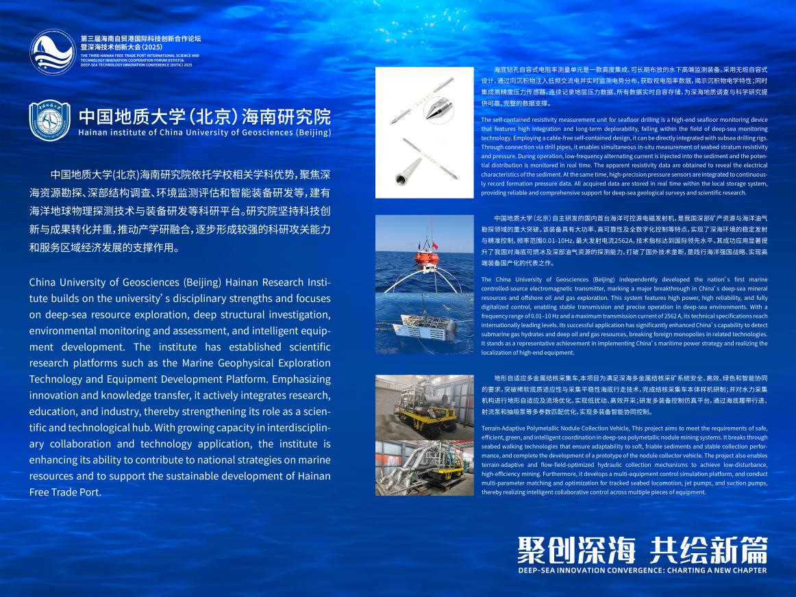 中国地质大学(北京)海南研究院成立以来,聚焦国家海洋战略和海南地域特色,围绕深海采矿技术与智能装备、海洋油气勘探与开发、海洋地质调查、海洋环境、海洋与极地法规政策等领域,此次参加海南自贸港国际科技创新合作论坛暨深海技术创新大会,是中国地质大学(北京)涉海装备研发力量在国际科技舞台上的展示,也是研究院在高水平科学研究和科技成果转化方面的尝试,海南研究院未来将会在在助力海南自由贸易港培育新质生产力方面继续贡献地大智慧和地大力量。