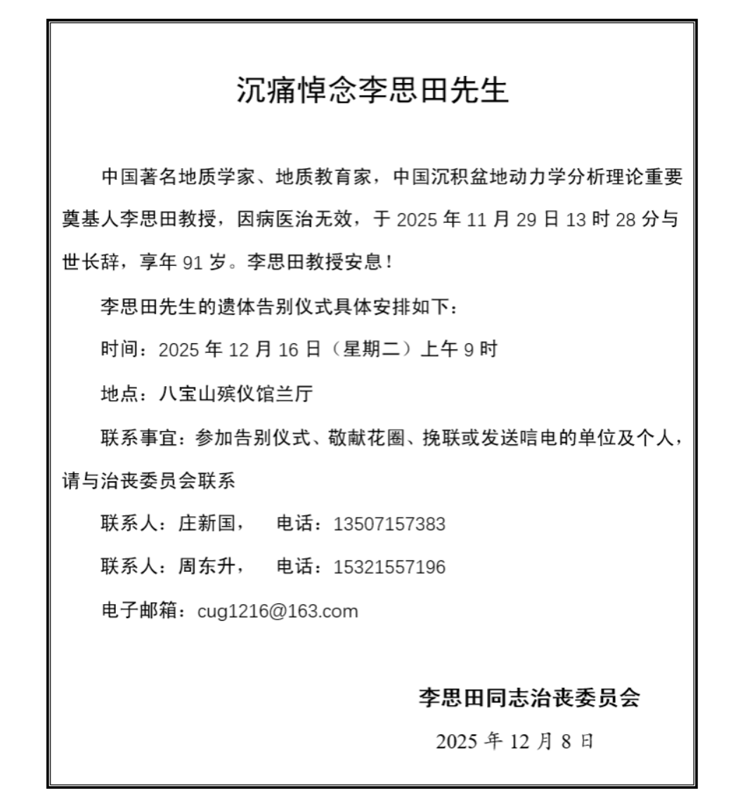 李思田(1934.11.9—2025.11.29),中国共产党党员,河北高阳人,汉族。1956年毕业于北京地质学院并留校任教。中国地质大学教授、博士生导师,多年担任沉积盆地及沉积矿产研究所所长。他毕生致力于沉积盆地与能源地质领域的科研和教学工作,是我国著名的沉积地质学家、能源地质学家、地质教育家,我国沉积盆地动力学分析理论的主要开拓者和奠基人,为国家能源安全、地学发展及人才培养做出了卓越贡献。