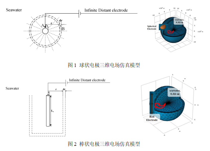 针对上述问题,本文提出了一种基于COMSOL Multiphysics多物理场仿真软件的极间电阻分析方法。该方法的核心是建立球状与棒状电极在海水中的三维电场模型(图1、图2),通过有限元仿真构建可控的数值模拟环境,有效降低了对实际海洋试验条件的依赖,实现了在陆上条件下对复杂海洋电性环境的准确模拟。本研究所建立的极间电阻模型与仿真方法,量化分析了电极长度、半径、极间距离及海水电阻率等多个因素对极间电阻的影响程度,在计算效率与准确性方面均体现出显著优势。