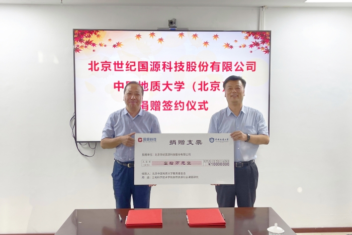 会上,国源科技通过中国地质大学教育基金会向学校捐赠十万元,用于资助土地科学技术学院建设。