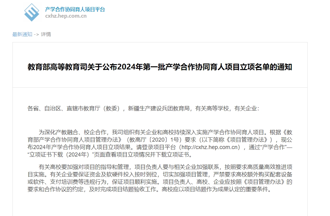 教育部产学合作协同育人项目是教育部深化产教融合、校企合作而实施的新型人才培养项目,以“政府搭台、企业支持、高校对接、共建共享”为宗旨,开辟了校企合作的崭新路径,促进了教育链、人才链与产业链、创新链的有机衔接。项目自2014年开始实施,始终坚持服务国家战略需求、产业转型升级和高素质创新人才培养,重点推进专业改造升级、课程内容重构、师资能力提升、实践条件改善、创新创业教育等,有力支撑“四新”建设,累计有上千家各类型企业和上千所本科高校参与,项目规模、质量、影响力持续提升。产学合作协同育人项目也是新一轮普通高等学校本科教育教学审核评估指标体系中的一个指标。