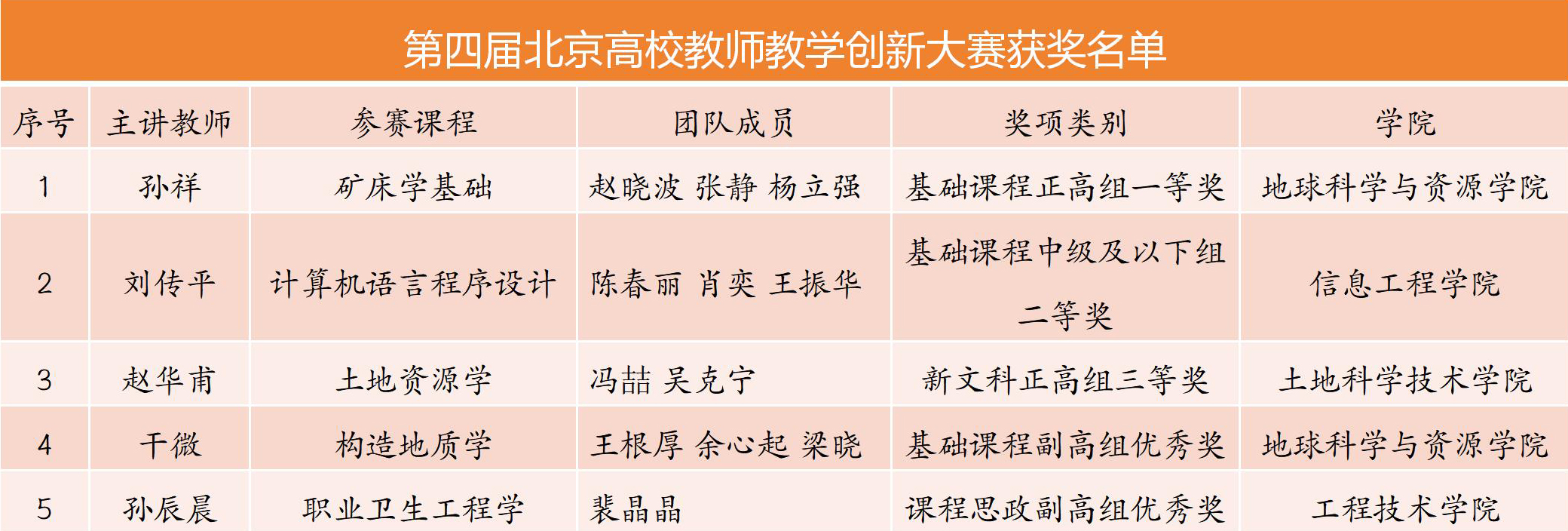 5月8日,第四届北京高校教师教学创新大赛获奖名单揭晓,我校推荐参赛教师团队共获得5个奖项,其中,地球科学与资源学院孙祥团队荣获基础课程正高组一等奖,获得第四届全国高校教师教学创新大赛推荐参赛资格;我校荣获优秀组织奖。