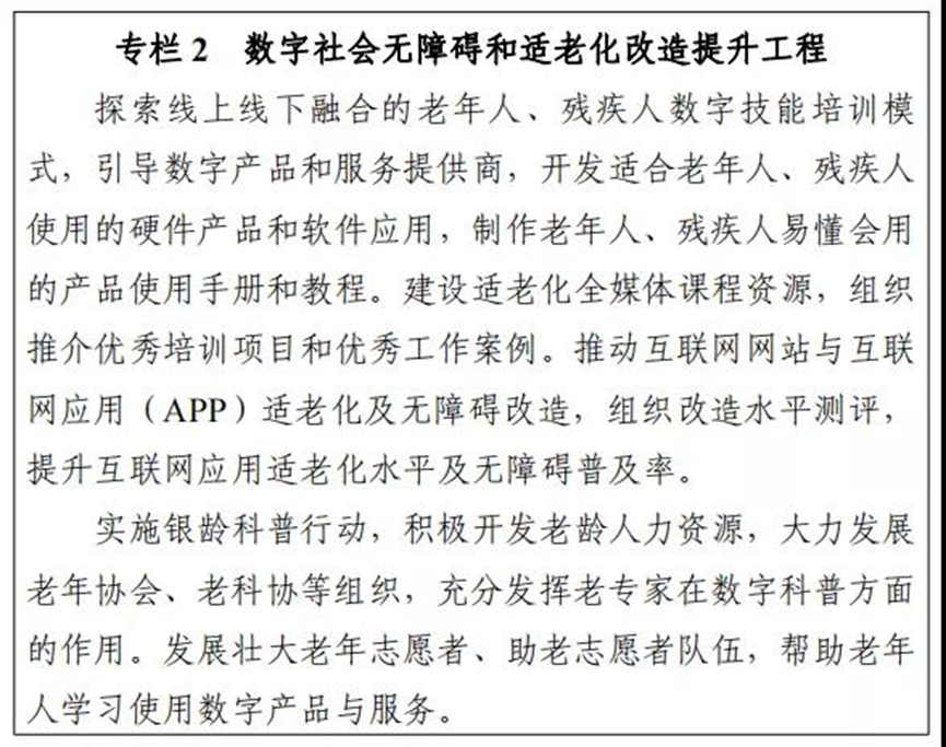 1. 优化完善数字资源获取渠道。加快千兆光网、5G网络、IPv6等新型基础设施建设部署,不断拓展网络覆盖范围、提升网络质量,提高数字设施和智能产品服务能力。加大适老化智能终端供给,推进互联网应用适老化改造。加快推动信息无障碍建设,打造推广数字化助残服务,运用数字技术为残疾人生活、就业、学习等增加便利。支持少数民族语言语音技术研发应用。有序引导科研院所、普通高校和职业院校、企业机构、团体组织、高端数字人才等发挥自身优势,开发设立数字素养与技能培训网站、移动应用程序和公众账号等,为数字资源提供多样化获取渠道。