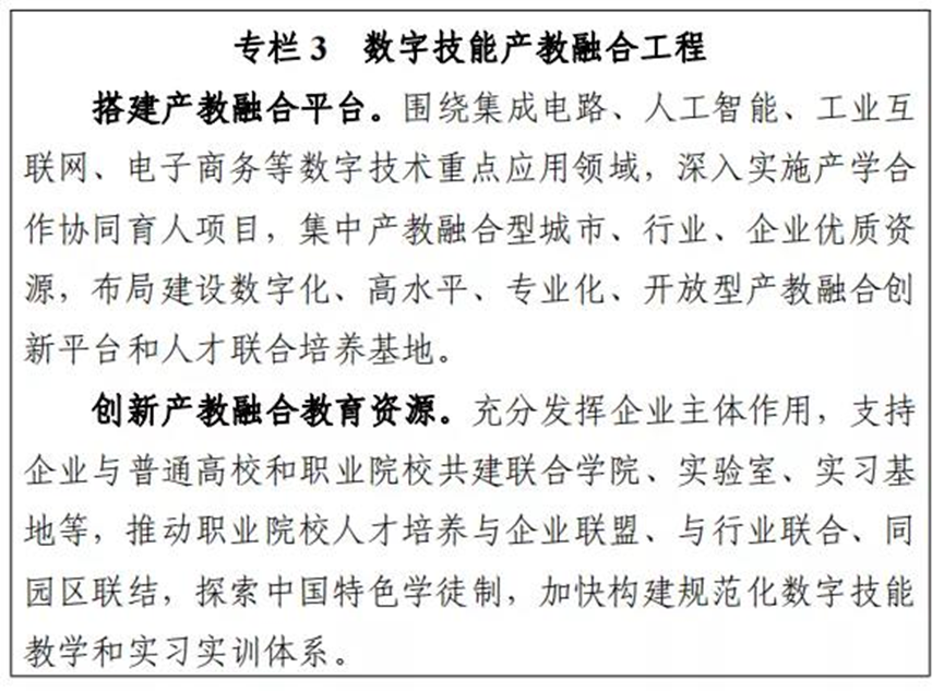 15. 完善数字技能职业教育培训体系。完善数字技能职业教育,加强职业院校数字技能类人才培养,动态更新职业教育专业目录,推进专业升级和数字化改造,优化完善课程设置,建设高水平数字技能职业教育教师队伍。制定完善数字技能职业教育国家标准,推行“学历证书+职业技能等级证书”制度,打造一批高水平数字技能职业院校和专业。加大数字技能职业培训力度,研制培训方案和内容标准,规范数字技能职业培训,试点探索“互联网+”职业技能培训模式,推动数字化培训模式发展。