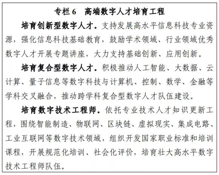 11. 提升新兴职业群体数字技能。面向“互联网+教育”、互联网医疗、电子商务、供应链管理服务、线上办公、“虚拟”产业园、“无人经济”等新业态新模式,制定数字领域新职业的职业标准,丰富职业培训课程,开展从业人员培训,壮大新兴职业群体人才队伍。引导支持新兴职业群体,积极利用5G、人工智能、虚拟现实、大数据、区块链等数字技术创新创业。