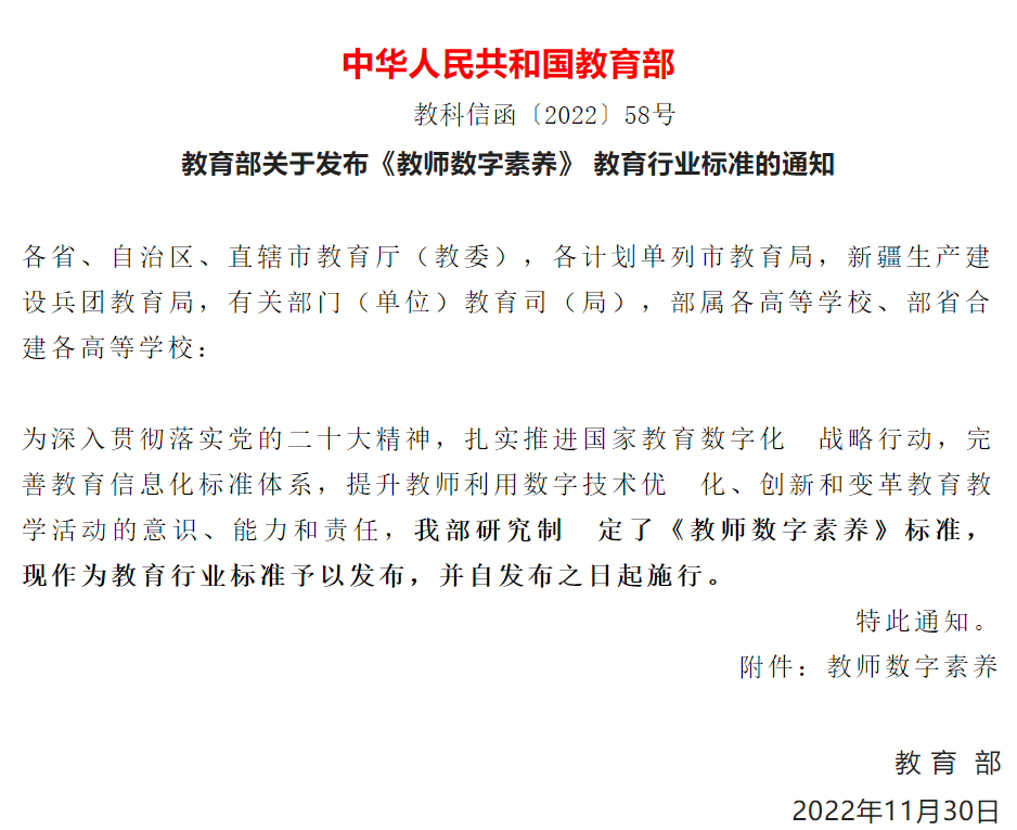 二十大报告明确提出要“推进教育数字化”,教师是提升教育水平的主力,要不断提升教师的能力素养。为了深入贯彻落实党的二十大精神,扎实推进国家教育数字化战略行动,完善教育信息化标准体系,提升教师利用数字技术优化、创新和变革教育教学活动的意识、能力和责任,教育部研究制定了《教师数字素养》标准,用于对教师数字素养的培训与评价。