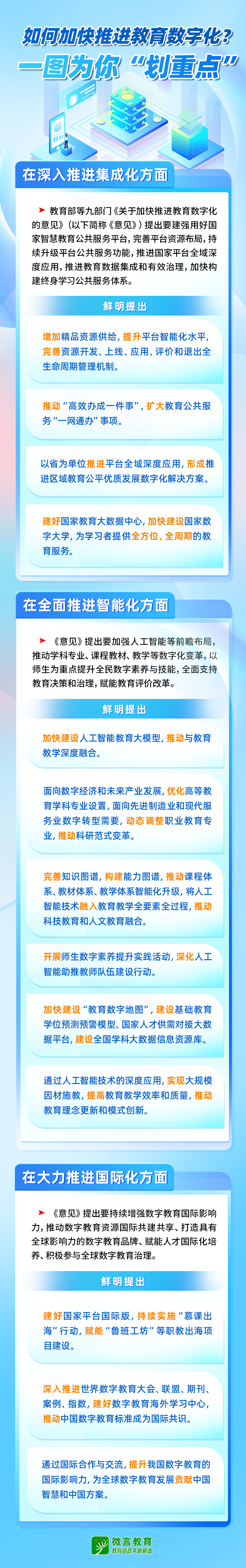 为贯彻落实《教育强国建设规划纲要(2024—2035年)》,以教育数字化为重要突破口,开辟教育发展新赛道和塑造发展新优势,全面支撑教育强国建设,近日,教育部等九部门联合发布《关于加快推进教育数字化的意见》,教育小微为你“划重点”——