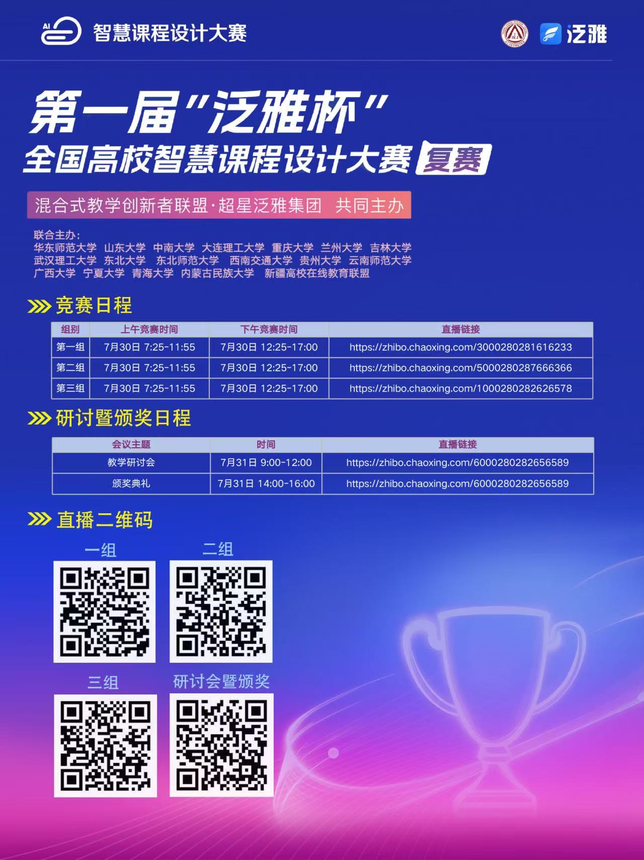 第一届“泛雅杯”全国高校智慧课程设计大赛的复赛正在进行!大赛全程在线直播,欢迎感兴趣的老师在线观看。