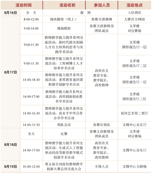 第五届大赛共设32个赛区,覆盖所有本科高校,覆盖所有学科门类,有12.7万名教师参加校赛,3.4万名教师参加省赛,最终588门课程的2253位教师(含团队教师)入围全国赛现场赛。全国赛期间将有教育部、中国高等教育学会、大赛组织机构领导、评审专家/监事、赛区嘉宾、参赛教师及团队教师、观摩教师等预计4000人参加大赛相关活动。
