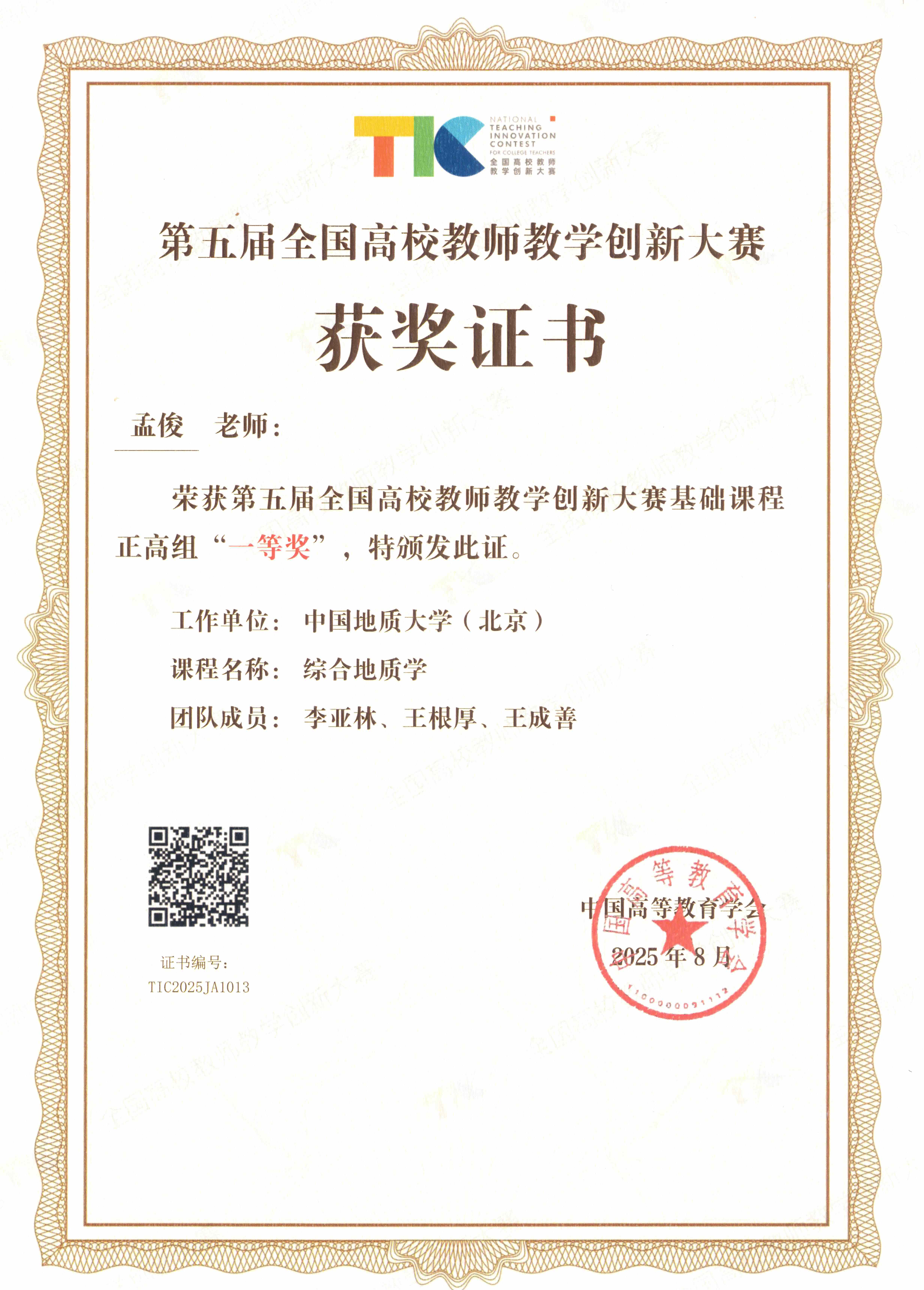 8月19日,第五届全国高校教师教学创新大赛在北京理工大学圆满落下帷幕。我校地球科学与资源学院孟俊教授团队荣获基础课程正高组一等奖,实现了历史性突破,创造了我校参赛以来的最好成绩。