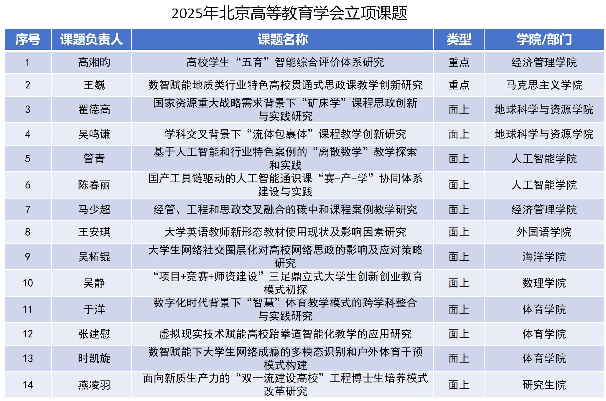 北京市高等教育学会日前公布2025年度课题立项结果,我校14项课题获批立项,其中重点课题2项、面上课题12项。