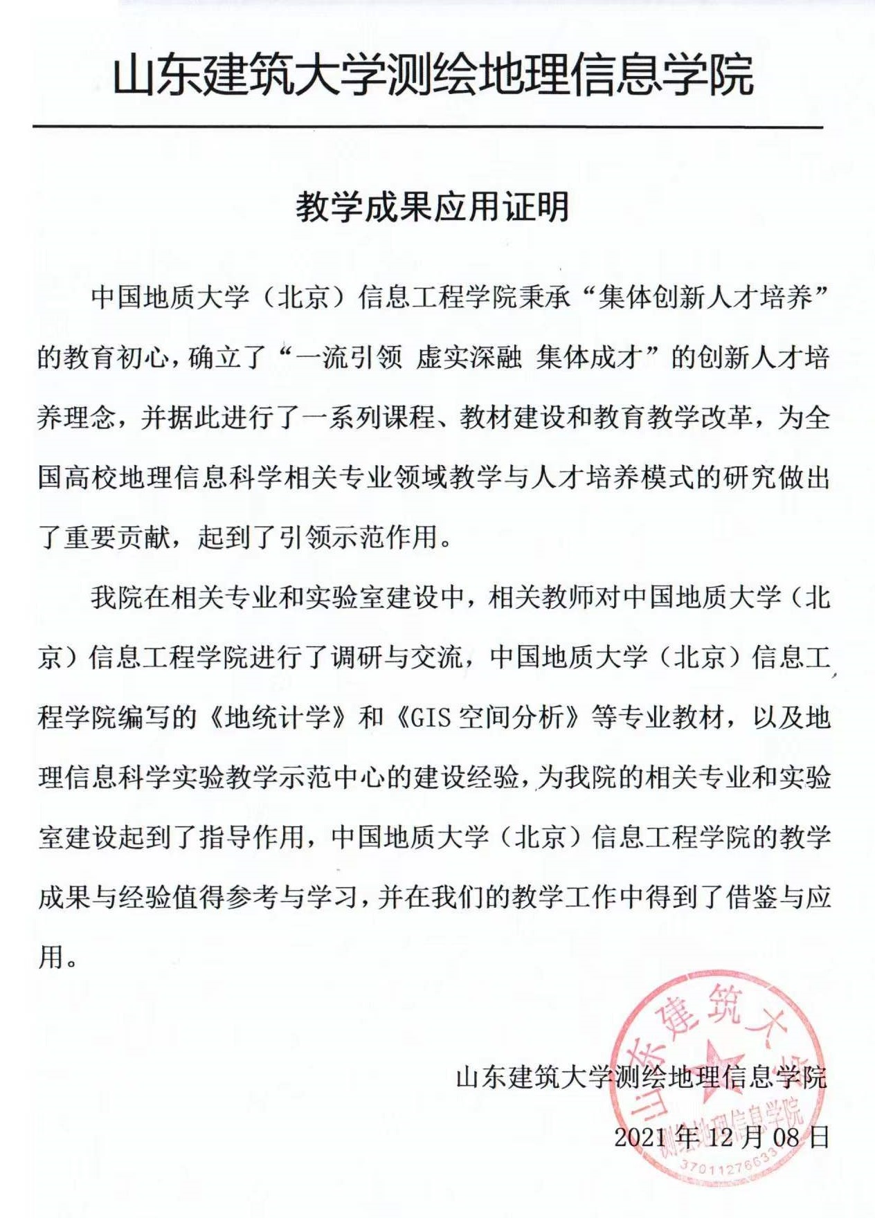 名称 | 山东建筑大学专业建设与教学成果应用证明 |