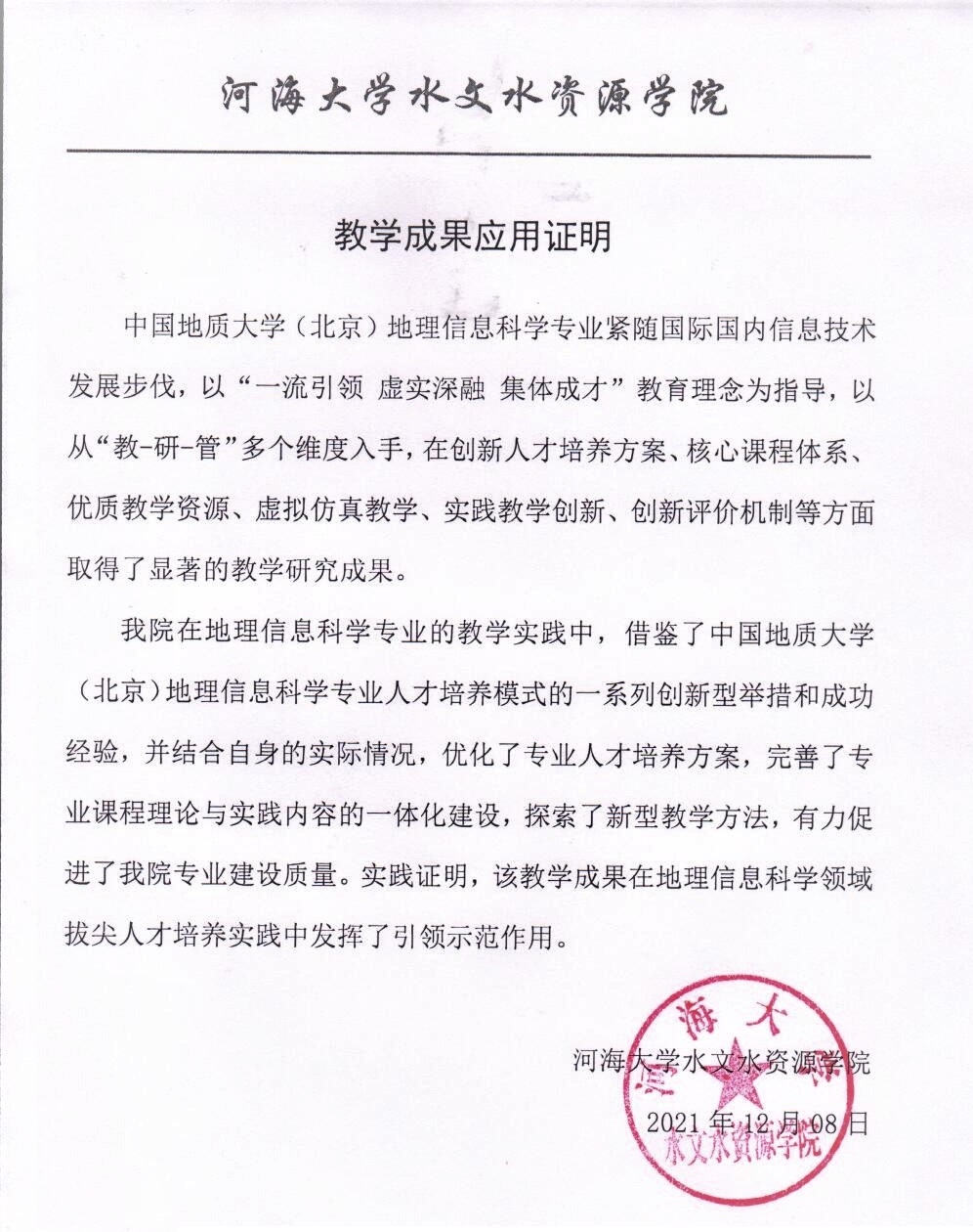 名称 | 河海大学专业建设与教学成果应用证明 |