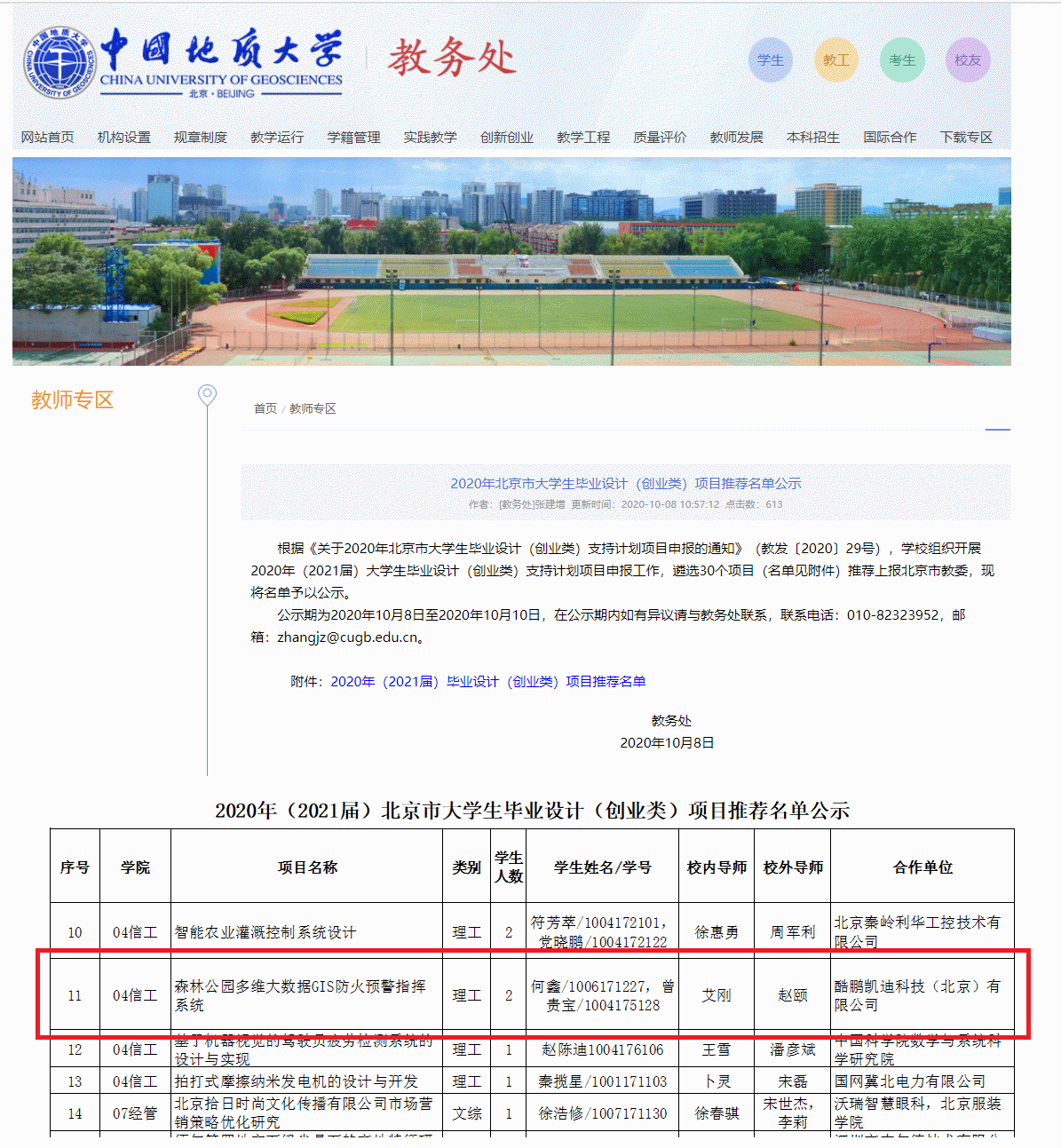 名称 | 2020年(2021届)北京市大学生毕业设计(创业类)项目——森林公园多维大数据GIS防火预警指挥系统 | ||