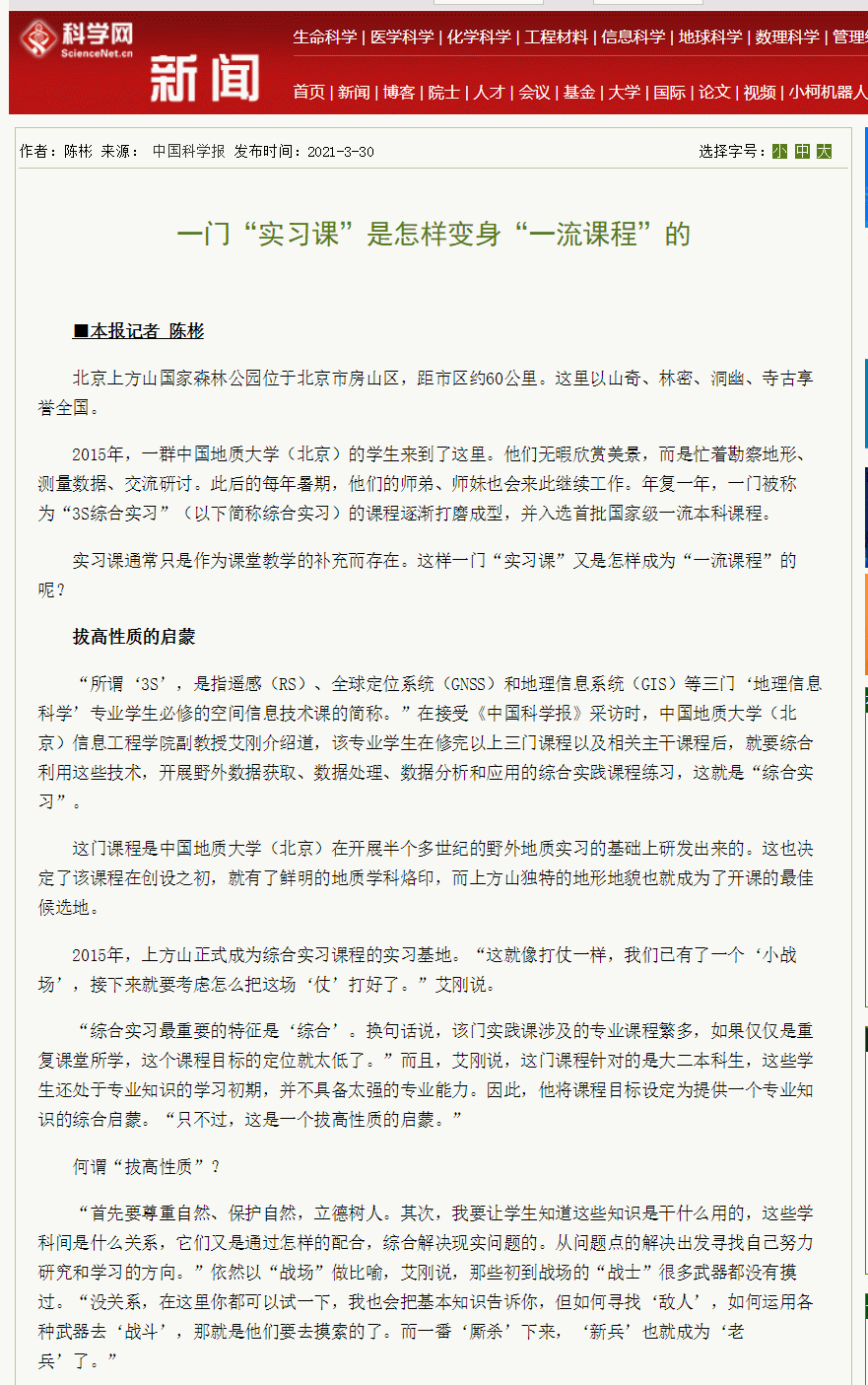 名称 | 中国科学报 报道基地建设成效——助力实践教学课程提升为国家一流课程的教学理念 | ||